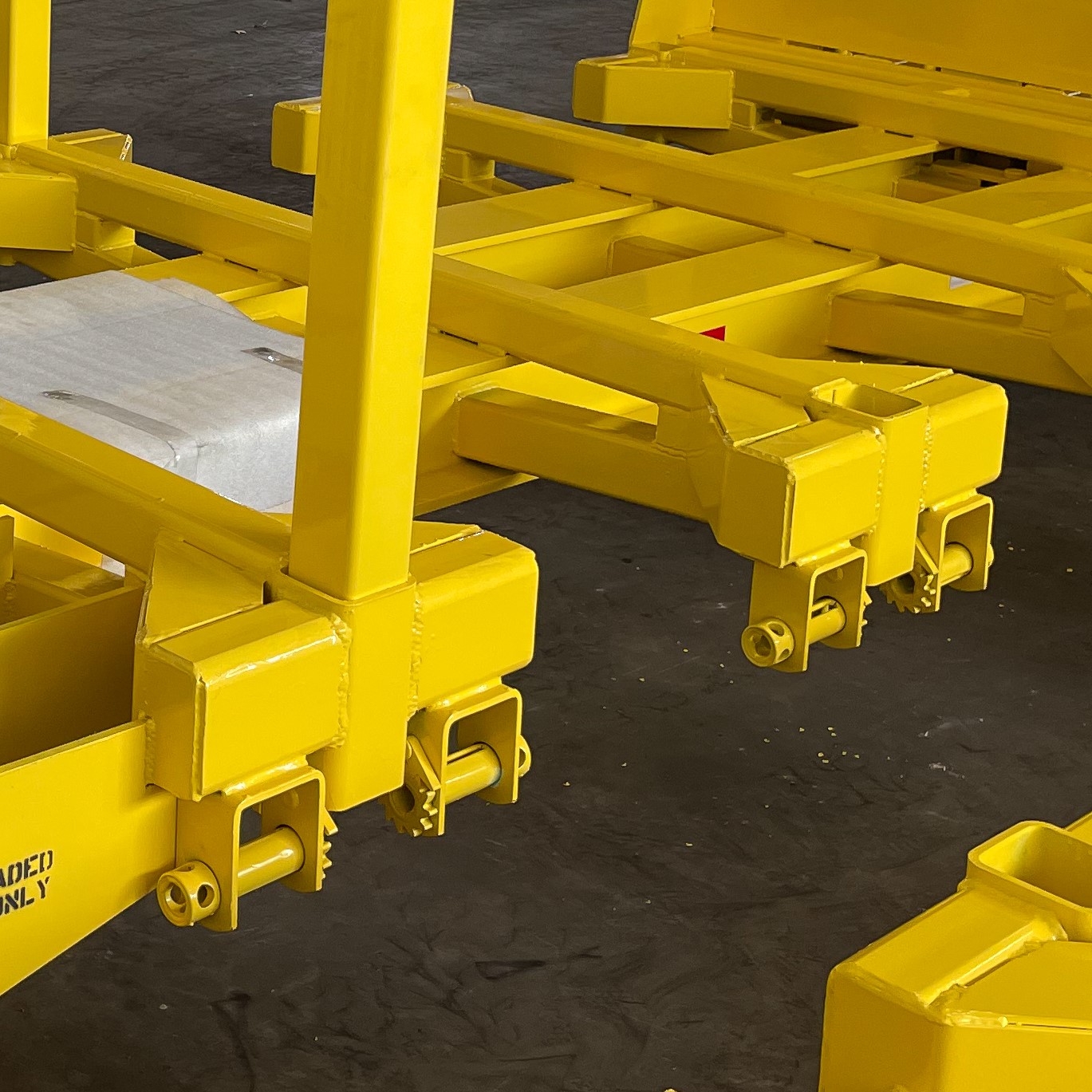 Constraining loads rely on 3 seperate methods. First, removeable stakes that keep the load from shifting off of the sides of trailer when loading. Lashing rings and winches are then used to restrain the load for transfer.